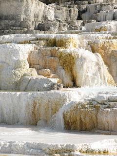 We arrived in Mammoth Hot Springs in the northwestern part of Yellowstone and got a nice campsite right in the park, but no electric or water. It was 90+ degrees and with no electricity, we had no AC, so went exploring the Mammoth Hot Springs Terraces. We had been here quite a few years ago, but the Terraces were dry. This time, they had water flowing and were incredibly beautiful.